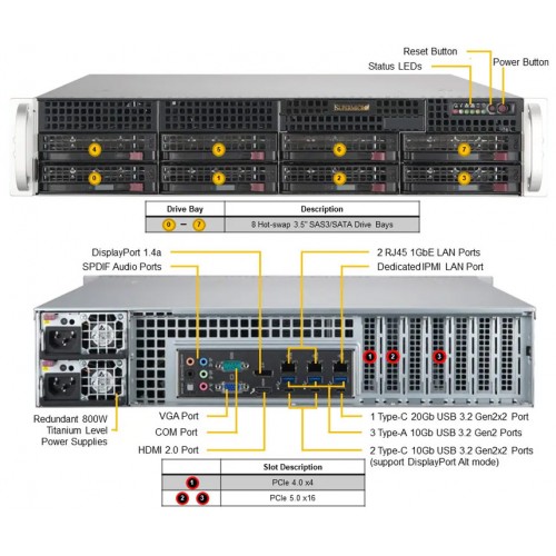 - Расширенные возможности хранения: Восемь отсеков 3.5'' SAS/SATA позволяют установить большое количество жестких дисков или SSD для хранения больших объемов данных.